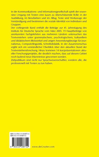Der vorliegende Band enthält die Beiträge zur 41. Jahrestagung des Instituts für Deutsche Sprache vom März 2005. 19 Hauptbeiträge von anerkannten Fachgelehrten aus mehreren Ländern untersuchen das Textverstehen unter grammatischem, psychologischem, kulturellem und didaktischem Blickwinkel und zeigen Anwendungsbezüge für Journalismus, Computerlinguistik, Schreibdidaktik. In der Zusammenschau ergibt sich ein verständlicher Überblick über den aktuellen Stand der Textverstehensforschung. Hinzu kommen 14 Kurzpräsentationen aktueller Forschungsprojekte, die deutlich machen, dass auf diesem Gebiet noch laufend neue Erkenntnisse gewonnen werden.