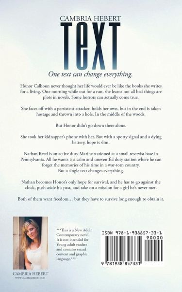 One text can change everything. Honor Calhoun never thought her life would ever be like the books she writes for a living. One morning while out for a run, she learns not all bad things are plots in novels. Some horrors can actually come true. She faces off with a persistent attacker, holds her own, but in the end is taken hostage and thrown into a hole. In the middle of the woods. But Honor didn't go down there alone. She took her kidnapper's phone with her. With a spotty signal and a dying battery, her hope is slim. Nathan Reed is an active duty Marine stationed at a small reserve base in Pennsylvania. All he wants is a calm and uneventful duty station where he can forget the memories of his time in a war-torn country. But a single text changes everything. Nathan becomes Honor's only hope for survival, and he has to go against the clock, push aside his past, and take on a mission for a girl he's never met. Both of them want freedom... but they have to survive long enough to obtain it.