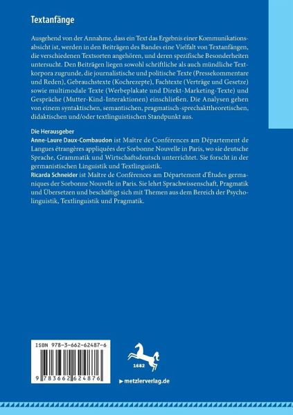 Ausgehend von der Annahme, dass ein Text das Ergebnis einer Kommunikationsabsicht ist, werden in den Beiträgen des Bandes eine Vielfalt von Textanfängen, die verschiedenen Textsorten angehören, und deren spezifische Besonderheiten untersucht. Den Beiträgen liegen sowohl schriftliche als auch mündliche Textkorpora zugrunde, die journalistische und politische Texte (Pressekommentare und Reden), Gebrauchstexte (Kochrezepte), Fachtexte (Verträge und Gesetze) sowie multimodale Texte (Werbeplakate und Direkt-Marketing-Texte) und Gespräche (Mutter-Kind-Interaktionen) einschließen. Die Analysen gehen von einem syntaktischen, semantischen, pragmatisch-sprechakttheoretischen, didaktischen und/oder textlinguistischen Standpunkt aus.