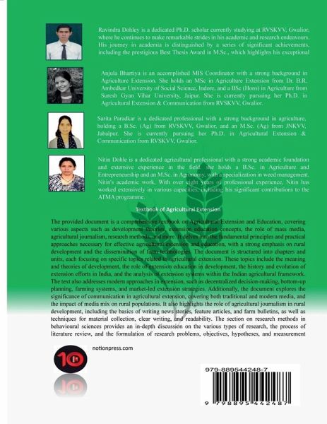 The provided document is a comprehensive textbook on Agricultural Extension and Education, covering various aspects such as development theories, extension education concepts, the role of mass media, agricultural journalism, research methods, and more. It delves into the fundamental principles and practical approaches necessary for effective agricultural extension and education, with a strong emphasis on rural development and the dissemination of farm technologies. The document is structured into chapters and units, each focusing on specific topics related to agricultural extension. These topics include the meaning and theories of development, the role of extension education in development, the history and evolution of extension efforts in India, and the analysis of extension systems within the Indian agricultural framework. The text also addresses modern approaches in extension, such as decentralized decision-making, bottom-up planning, farming systems, and market-led extension strategies. Additionally, the document explores the significance of communication in agricultural extension, covering both traditional and modern media, and the impact of media mix on rural populations. It also highlights the role of agricultural journalism in rural development, including the basics of writing news stories, feature articles, and farm bulletins, as well as techniques for material collection, clear writing, and readability.