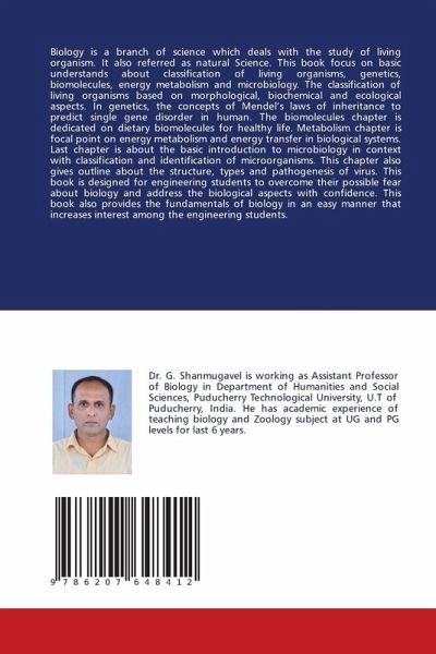 Biology is a branch of science which deals with the study of living organism. It also referred as natural Science. This book focus on basic understands about classification of living organisms, genetics, biomolecules, energy metabolism and microbiology. The classification of living organisms based on morphological, biochemical and ecological aspects. In genetics, the concepts of Mendel's laws of inheritance to predict single gene disorder in human. The biomolecules chapter is dedicated on dietary biomolecules for healthy life. Metabolism chapter is focal point on energy metabolism and energy transfer in biological systems. Last chapter is about the basic introduction to microbiology in context with classification and identification of microorganisms. This chapter also gives outline about the structure, types and pathogenesis of virus. This book is designed for engineering students to overcome their possible fear about biology and address the biological aspects with confidence. This book also provides the fundamentals of biology in an easy manner that increases interest among the engineering students.