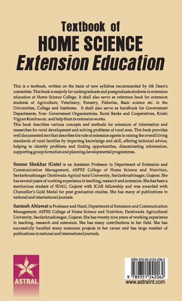 This is a textbook, written on the basis of new syllabus recommended by 4th Dean's committee. This book is majorly for undergraduate and postgraduate students in extension education at Home Science College. It shall also serve as reference book for extension students of Agriculture, Veterinary, Forestry, Fisheries, Basic Science etc. in the Universities, College and Institutes. It shall also serve as handbook for Government Departments, Non- Government Organizations, Rural Banks and Cooperatives, Krishi Vigyan Kendras etc. and help them in extension works. This book describes various concepts and methods for extension of information and researches for rural development and solving problems of rural area. This book provides well documented text that describes the role of extension agents in raising the overall living standards of rural families by imparting knowledge and skill, offering technical advice, helping to identify problems and finding opportunities, disseminating information, supporting group formation and planning developmental programmes.
