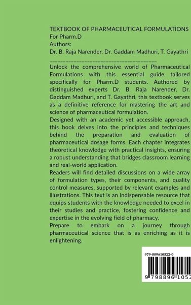 Unlock the comprehensive world of Pharmaceutical Formulations with this essential guide tailored specifically for Pharm.D students. Authored by distinguished experts Dr. B. Raja Narender, Dr. Gaddam Madhuri, and T. Gayathri, this textbook serves as a definitive reference for mastering the art and science of pharmaceutical formulation. Designed with an academic yet accessible approach, this book delves into the principles and techniques behind the preparation and evaluation of pharmaceutical dosage forms. Each chapter integrates theoretical knowledge with practical insights, ensuring a robust understanding that bridges classroom learning and real-world application.This book is written as Per PCI syllabus. Readers will find detailed discussions on a wide array of formulation types, their components, and quality control measures, supported by relevant examples and illustrations. This text is an indispensable resource that equips students with the knowledge needed to excel in their studies and practice, fostering confidence and expertise in this field Prepare to embark on a journey through pharmaceutical science that is as enriching as it is enlightening.