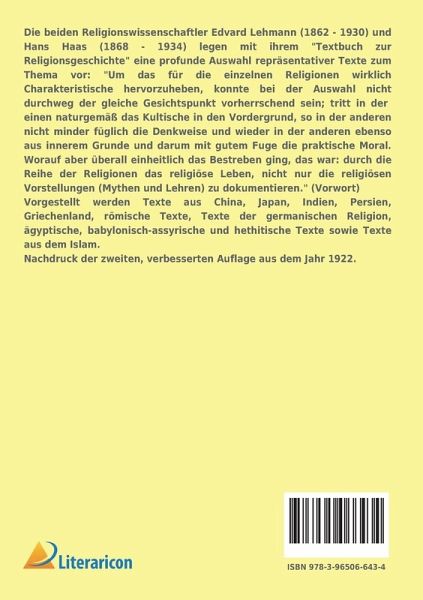Die beiden Religionswissenschaftler Edvard Lehmann (1862 - 1930) und Hans Haas (1868 - 1934) legen mit ihrem "Textbuch zur Religionsgeschichte" eine profunde Auswahl repräsentativer Texte zum Thema vor: "Um das für die einzelnen Religionen wirklich Charakteristische hervorzuheben, konnte bei der Auswahl nicht durchweg der gleiche Gesichtspunkt vorherrschend sein; tritt in der einen naturgemäß das Kultische in den Vordergrund, so in der anderen nicht minder füglich die Denkweise und wieder in der anderen ebenso aus innerem Grunde und darum mit gutem Fuge die praktische Moral. Worauf aber überall einheitlich das Bestreben ging, das war: durch die Reihe der Religionen das religiöse Leben, nicht nur die religiösen Vorstellungen (Mythen und Lehren) zu dokumentieren." (Vorwort) Vorgestellt werden Texte aus China, Japan, Indien, Persien, Griechenland, römische Texte, Texte der germanischen Religion, ägyptische, babylonisch-assyrische und hethitische Texte sowie Texte aus dem Islam. Nachdruck der zweiten, verbesserten Auflage aus dem Jahr 1922.