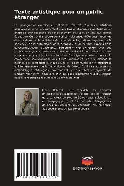 La monographie examine et définit le rôle clé d'un texte artistique pédagogique dans l'enseignement d'une langue étrangère aux étudiants en philologie (sur l'exemple de l'enseignement du russe en tant que langue étrangère). Ce travail s'appuie sur des connaissances théoriques modernes dans le domaine de la théorie du texte, de la linguistique cognitive, de la sociologie, de la culturologie, de la pédagogie et de certains aspects de la psycholinguistique. L'expérience personnelle d'enseignement avec des publics étrangers a permis de souligner l'efficacité de l'utilisation d'une nouvelle approche interdisciplinaire dans l'enseignement afin de former la compétence linguoculturelle des futurs spécialistes, ce qui implique la maîtrise des compétences linguistiques de la communication interculturelle et interpersonnelle, de la perception et de l'affect. Ce livre s'adresse aux méthodologues-philologues, aux étudiants et aux futurs enseignants de langues étrangères, ainsi qu'à tous ceux qui s'intéressent aux questions liées à l'enseignement d'une langue non maternelle.