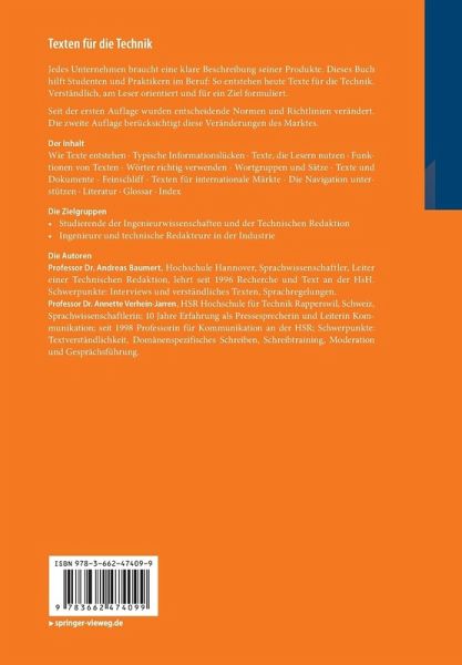 Jedes Unternehmen braucht eine klare Beschreibung seiner Produkte. Dieses Buch hilft Studenten und Praktikern im Beruf: So entstehen heute Texte für die Technik. Verständlich, am Leser orientiert und für ein Ziel formuliert.Seit der ersten Auflage wurden entscheidende Normen und Richtlinien verändert. Die zweite Auflage berücksichtigt diese Veränderungen des Marktes.