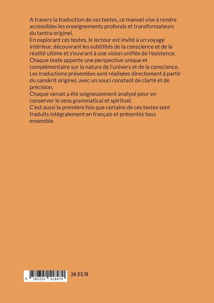 A travers la traduction de ces textes, ce manuel vise à rendre accessibles les enseignements profonds et transformateurs du tantra originel.En explorant ces textes, le lecteur est invité à un voyage intérieur, découvrant les subtilités de la conscience et de la réalité ultime et s'ouvrant à une vision unifiée de l'existence.Chaque texte apporte une perspective unique et complémentaire sur la nature de l'univers et de la conscience.Les traductions présentées sont réalisées directement à partir du sanskrit originel, avec un souci constant de clarté et de précision.Chaque verset a été soigneusement analysé pour en conserver le sens grammatical et spirituel.C'est aussi la première fois que certains de ces textes sont traduits intégralement en français et présentés tous ensemble.