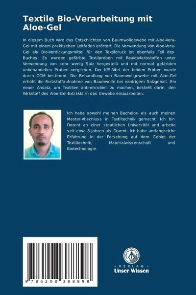 In diesem Buch wird das Entschlichten von Baumwollgewebe mit Aloe-Vera-Gel mit einem praktischen Leitfaden erörtert. Die Verwendung von Aloe-Vera-Gel als Bio-Verdickungsmittel für den Textildruck ist ebenfalls Teil des Buches. Es wurden gefärbte Textilproben mit Reaktivfarbstoffen unter Verwendung von sehr wenig Salz hergestellt und mit normal gefärbten unbehandelten Proben verglichen. Der K/S-Wert der beiden Proben wurde durch CCM bestimmt. Die Behandlung von Baumwollgewebe mit Aloe-Gel erhöht die Farbstoffaufnahme von Baumwolle bei niedrigem Salzgehalt. Ein neuer Ansatz, um Textilien antimikrobiell zu machen, besteht darin, den Wirkstoff des Aloe-Gel-Extrakts in das Gewebe einzuarbeiten.