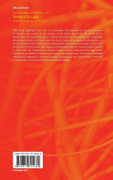 Sustainable development approaches for Sri Lankan Textile and Apparel industry.- "The quality that comes from oral tradition is the trend and luxury." Indigenous hand-loom textiles show potential towards sustainable development.- Heritage of Living Entity and Living Skills: Advancing Sustainability Goals 1 & 4 in Handloom Textiles.- The Potential of Utilizing Sri Lankan Banana-Agro Waste to Generate Sustainable Textiles.- Achieving Sustainable Development Goals: The Impact of the Apparel and Textile Industry on the Eradication of Poverty in Sri Lanka.- AS GOOD AS NEW: A Study on Sri Lanka Consumers' secondhand fashion consumption.- The use of ISO 14062:2002 sustainable design strategies of the designers to address SDG 12: Ensure sustainable consumption and production patterns in the export apparel industry in Sri Lanka.- Sustainability & Textile Testing.- An Investigation of Fashion for Career Development in Women's Role in the Apparel Industry in Sri Lanka.- Eco-Friendly Dyeing Techniques for Banana Fibers from Banana application in the Sri Lankan context. Promoting Sustainable Coloration Methods.