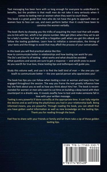 Text messaging has been here with us long enough for everyone to understand its benefits, but the problem is that most men do not take it very seriously when it comes to texting men or women when they want to court them. This book is a great guide that men who do not have the guts to approach men or women face to face can use, and even perform better than it could have been to convince the women verbally. The book starts by showing you the tricks of acquiring the main tool that will enable you to link with her, which is her phone number. Men get jitters when they set to ask for a lady's number, but that will be a forgotten past when you get this eBook and follow the texting guidelines. Learn how to initialize a conversation, the timing of your texts and the things to avoid that may affect the process of your conversation. In this book you will find practical advice like this: How to communicate better in relationships and how texting can work for you The Do's and Don'ts of texting - what works and what should be avoided What questions and words are sure to get a response - and which ones to avoid As you search for true love, these texting tips and techniques will guide you. Study this volume well, and use it to find the best kind of man - the one you can teach to communicate better - the one special person who appreciates you! The book has tips you can follow when texting a man or woman and keep him/ her engaged throughout the session. The way you frame the text greatly influence how he/ she feels about you as well as how you think about him/ her. The book is recommended for women or men who want to cut time on building a deep bond with their counterpart in a drastic way. It reveals exactly how to text and make someone fall in love with your written message. Texting is very powerful if done correctly at the appropriate time. It can fully reignite the desires and as well bring the playfulness you had in your relationship back. Being informed means, you are powerful. Through reading the book, you can attest that you have gotten useful information as well as new knowledge on the texting tips. Thank you for reading through the book. Feel free to share with your friends or family and let them take a sip of these golden texting tips.