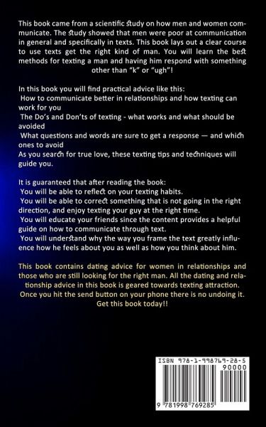 This book came from a scientific study on how men and women communicate. The study showed that men were poor at communication in general and specifically in texts. This book lays out a clear course to use texts get the right kind of man. You will learn the best methods for texting a man and having him respond with something other than "k" or "ugh"! In this book you will find practical advice like this: How to communicate better in relationships and how texting can work for you The Do's and Don'ts of texting - what works and what should be avoided What questions and words are sure to get a response - and which ones to avoid As you search for true love, these texting tips and techniques will guide you. It is guaranteed that after reading the book: You will be able to reflect on your texting habits. You will be able to correct something that is not going in the right direction, and enjoy texting your guy at the right time. You will educate your friends since the content provides a helpful guide on how to communicate through text. You will understand why the way you frame the text greatly influence how he feels about you as well as how you think about him. This book contains dating advice for women in relationships and those who are still looking for the right man. All the dating and relationship advice in this book is geared towards texting attraction. Once you hit the send button on your phone there is no undoing it. Get this book today!!