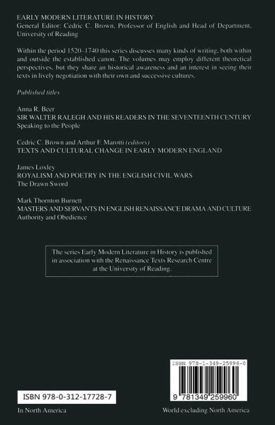 Acknowledgements - Notes on Contributors - Introduction - Complications of Intertextuality: John Fisher, Katherine Parr, and 'The Book of the Crucifix'; J.Mueller - Southwell's Remains: Catholicism and Anti-Catholicism in Early Modern England; A.F.Marotti - 'A Very Good Trumpet': Richard Hakluyt and the Politics of Overseas Expansion; P.Neville-Sington - Sidney's Arcadia as Cultural Monument and Proto-Novel; P.Lindenbaum - The Triumph of Time: the Fortunate Readers of Robert Greene's Pandosto; L.Humphrey Newcomb - Editing Sexuality, Narrative, and Authorship: The Altered Texts of Shakespeare's Lucrece; S.Roberts - The Birth of the Author; R.Dutton - Mending and Bending the Occasional Text: Collegiate Elegies and the Case of 'Lycidas'; C.C.Brown - Between the 'Triumvirate of Wit' and the Bard: the English Dramatic Canon, 1660-1720; P.Kewes - Friends or Lovers: Sensitivity to Homosexual Implications in Adaptations of Shakespeare, 1640-1701; P.Hammond - Index
