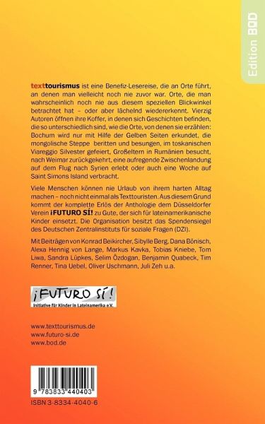 "texttourismus" ist eine Benefiz-Lesereise, die an Orte führt, an denen man vielleicht noch nie zuvor war. Orte, die man wahrscheinlich noch nie aus diesem speziellen Blickwinkel betrachtet hat ¿ oder aber lächelnd wiedererkennt. Vierzig Autoren öffnen ihre Koffer, in denen sich Geschichten befinden, die so unterschiedlich sind, wie die Orte, von denen sie erzählen: Bochum wird nur mit Hilfe der Gelben Seiten erkundet, die mongolische Steppe beritten und besungen, im toskanischen Viareggio Silvester gefeiert, Großeltern in Rumänien besucht, nach Weimar zurückgekehrt, eine aufregende Zwischenlandung auf dem Flug nach Syrien erlebt oder auch eine Woche auf Saint Simons Island verbracht. Viele Menschen können nie Urlaub von ihrem harten Alltag machen noch nicht einmal als Texttouristen. "texttourismus"-Herausgeber Lutz Becker, Jahrgang 1967, engagiert sich seit Jahren für die Düsseldorfer Organisation ¡FUTURO SÍ!, die sich für Straßenkinder in Lateinamerika einsetzt. Neben der spontanen Idee, gemeinsam mit den beiden Journalistinnen Ina Simone Mautz und Jana Schroeter eine Anthologie zusammenzustellen, die prominente Autoren und noch weitgehend unentdeckte Talente vereint, kam daher schnell der Gedanke hinzu, mit dem Erlös des Projektes Gutes zu tun und so Menschen, die in einer weniger farbenfrohen Welt leben, zu helfen. Der komplette Erlös des Projektes kommt ¡FUTURO SÍ! zu Gute. Die Organisation besitzt das Spendensiegel des Deutschen Zentralinstituts für soziale Fragen (DZI). Mit Beiträgen von Konrad Beikircher, Sibylle Berg, Dana Bönisch, Alexa Hennig von Lange, Markus Kavka, Tobias Kniebe, Tom Liwa, Sandra Lüpkes, Selim Özdogan, Benjamin Quabeck, Tim Renner, Tina Uebel, Oliver Uschmann, Juli Zeh u.a.