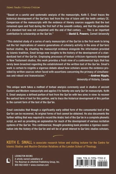 This book pursues the two main goals of textual criticism concerning ancient texts to the text of the Qur'an: 1) to discern the earliest available form of the text, and 2) to illuminate the consequent history of the text. Keith Small shows that the earliest obtainable text is an early edited form of the Arabic consonantal text, but not the original texts described in Islamic historical sources.