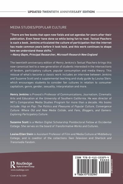 The twentieth anniversary edition of Henry Jenkins's Textual Poachers brings this now-canonical text to a new generation of students interested in the intersections of fandom, participatory culture, popular consumption and media theory. This reissue of what's become a classic work includes an interview between Jenkins and Suzanne Scott and a supplemental study guide by Louisa Stein, encouraging students to consider fan cultures in relation to consumer capitalism, genre, gender, sexuality, interpretation and more.