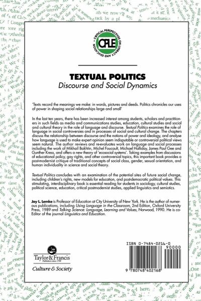 Texts record the meanings we make: in words, pictures and deeds, and politics chronicles our uses of power in shaping social relationships large and small. Textual politics is about meaning - the meaning we make with words and with the symbolic values of every object and action.; The book begins with an introduction which discusses the relationship between Discourse And The Notions Of Power And Ideology. These Concepts Are Then applied to major issues: the social construction of class, gender and individuality; the rhetoric of polarizing social controversies religious fundamentalism vs. gay rights; and the abuse of technical language in policy arguments educational research vs. conservative politics. The book ends with chapters which extend the theory to processes of large- scale social change and apply it to the challenges facing education and political action in the new global information century.