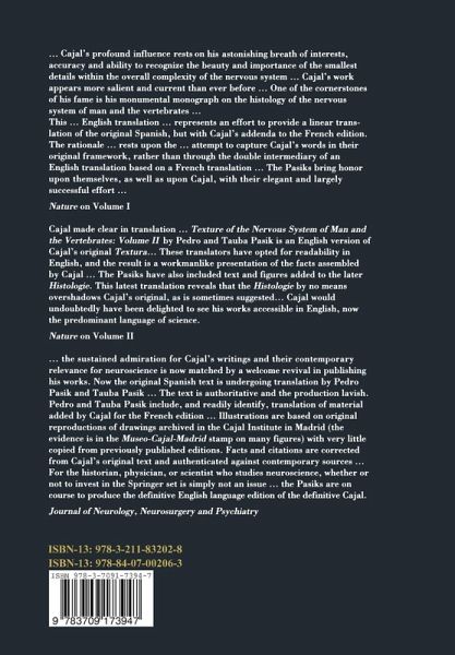 The third and the other two volumes offer the scientific community the works and thoughts of Santiago Ramón y Cajal by the faithful rendition of the original Spanish version of the Texture of the Nervous System of Man and the Vertebrates (1899-1904), with additional facts contained in the French translation (1909-1911). These non-English versions are being quoted an average of 200 times yearly in the scientific literature. The collection will represent the "definitive Cajal" to be used by scientists and scholars interested in the original thoughts of probably the most prominent neuroscientist…mehr