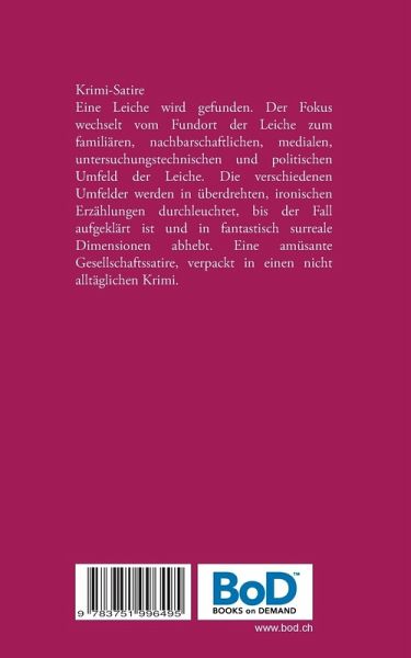 Eine Leiche wird gefunden. Der Fokus wechselt vom Fundort der Leiche zum familiären, nachbarschaftlichen, medialen, untersuchungstechnischen und politischen Umfeld der Leiche. Die verschiedenen Umfelder werden in überdrehten, ironischen Erzählungen durchleuchtet, bis der Fall aufgeklärt ist und in fantastisch surreale Dimensionen abhebt. Eine amüsante Gesellschaftssatire, verpackt in einen nicht alltäglichen Krimi.