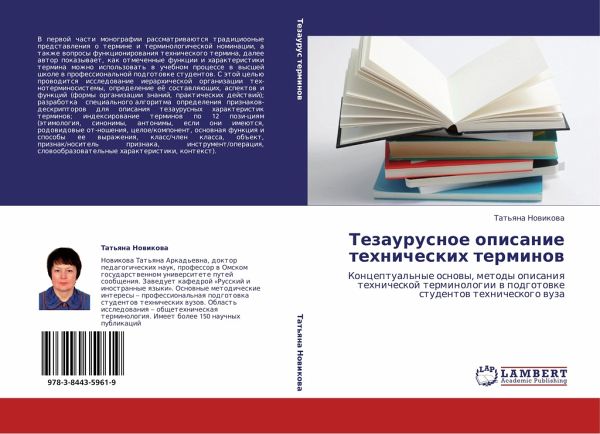 V perwoj chasti monografii rassmatriwaütsq tradicioonye predstawleniq o termine i terminologicheskoj nominacii, a takzhe woprosy funkcionirowaniq tehnicheskogo termina, dalee awtor pokazywaet, kak otmechennye funkcii i harakteristiki termina mozhno ispol'zowat' w uchebnom processe w wysshej shkole w professional'noj podgotowke studentow. S ätoj cel'ü prowoditsq issledowanie ierarhicheskoj organizacii teh-noterminosistemy, opredelenie eö sostawlqüschih, aspektow i funkcij (formy organizacii znanij, prakticheskih dejstwij); razrabotka special'nogo algoritma opredeleniq priznakow-deskriptorow dlq opisaniq tezaurusnyh harakteristik terminow; indexirowanie terminow po 12 pozi-ciqm (ätimologiq, sinonimy, antonimy, esli oni imeütsq, rodowidowye ot-nosheniq, celoe/komponent, osnownaq funkciq i sposoby ee wyrazheniq, klass/chlen klassa, ob#ekt, priznak/nositel' priznaka, instrument/operaciq, slowoobrazowatel'nye harakteristiki, kontext).