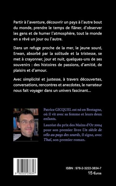 Partir à l'aventure, découvrir un pays à l'autre bout du monde, prendre le temps de flâner, d'observer les gents et d'observer les gens et de humer l'atmosphère, tout le monde en a rêvé un jour ou l'autre.Dans un refuge proche de la mer, le jeune sourd, Erwan, absorbé par la solitude et la tristesse, se met à crayonner, jour et nuit, quelques-uns de ses souvenirs : des histoires de passions, d'amitié, de plaisirs et d'amour.Avec simplicité et justesse, à travers découvertes, conversations, rencontres et anecdotes, le narrateur nous fait voyager dans un univers fascinant...