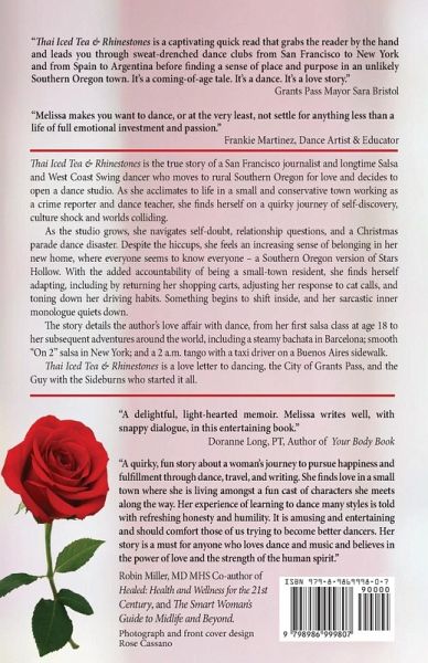 Thai Iced Tea & Rhinestones is the quirky true story of a San Francisco journalist and longtime Salsa and West Coast Swing dancer who moves to rural Oregon for love and decides to open a dance studio. As she acclimates to life in a small and conservative town working as a crime reporter and dance teacher, she finds herself on an sometimes-bumpy journey of self-discovery, culture shock and worlds colliding. With the studio growing, she navigates self-doubt, relationship questions, and a Christmas parade dance disaster. Despite the hiccups, she feels an increasing sense of belonging in her new home, where everyone seems to know everyone - a Southern Oregon version of Stars Hollow. At first, the smallness of the town is disorienting: her new dance studio is across a hallway from her boyfriend's ex-girlfriend's photography studio, and a suspect she put in the police blotter for belly-bumping the manager of the Circle K shows up for West Coast Swing one night. But her initial claustrophobia gives way to a feeling of coziness as she begins to settle in. With the added accountability of being a small-town resident, she finds herself changing her behavior, including by returning her shopping carts, adjusting her response to cat calls, and toning down her driving habits. Something begins to shift inside, and her sarcastic inner monologue quiets down. The story details the author's love affair with dance, from her first salsa class at age 18 to her subsequent adventures around the world, including a steamy bachata in Barcelona; smooth "On 2" salsa in New York; and a 2 a.m. tango with a taxi driver on a Buenos Aires sidewalk. As a new studio owner, she watches her students fall in love with dance and discover the same pleasures she has found on the dance floor: connection, community, belonging, self-expression, and joy. Thai Iced Tea & Rhinestones is a love letter to dancing, the City of Grants Pass, and the Guy with the Sideburns who started it all.