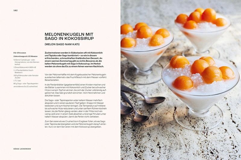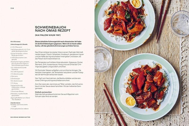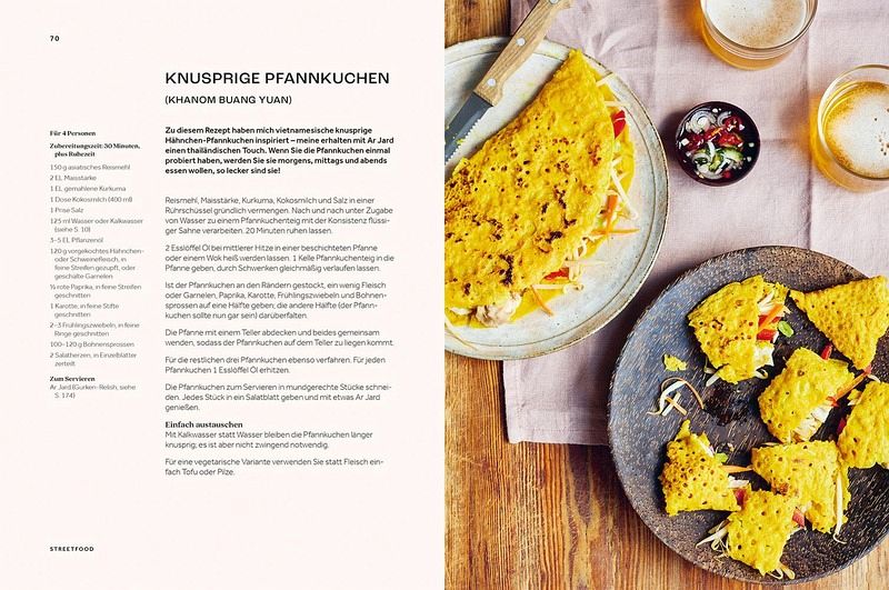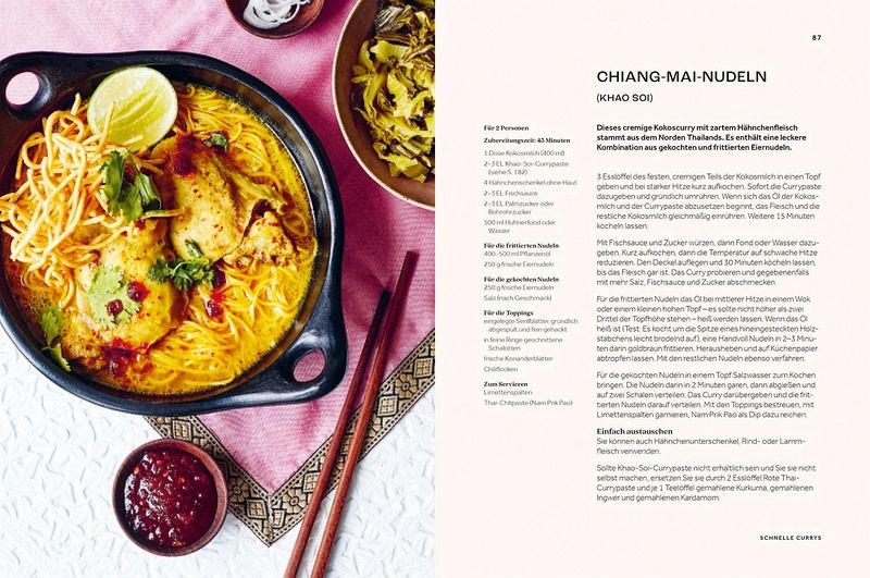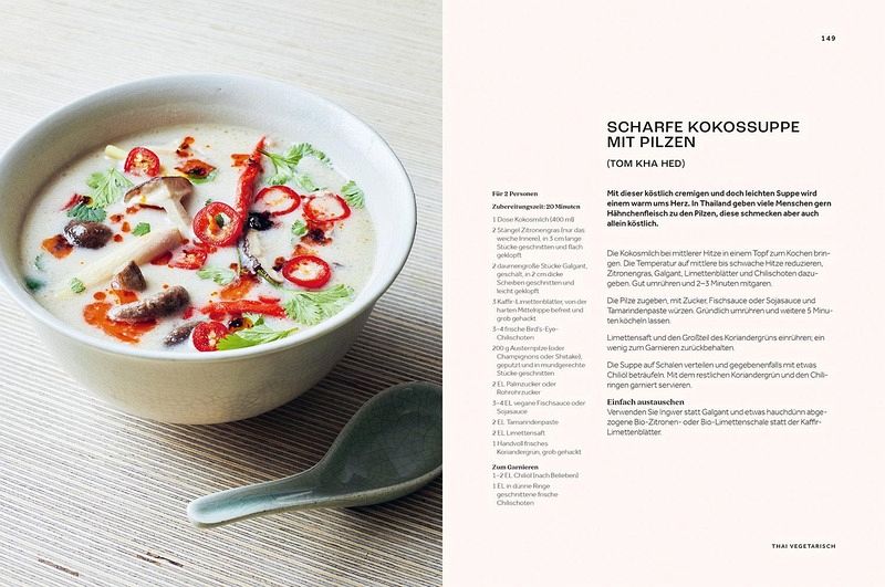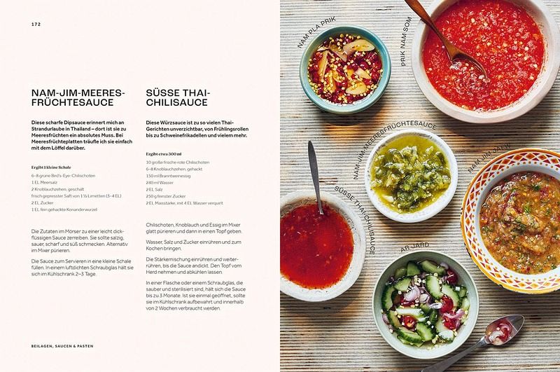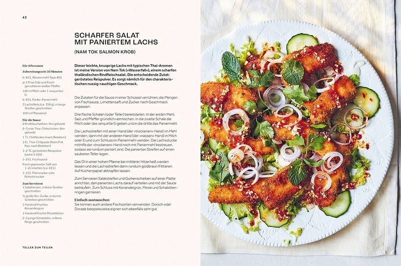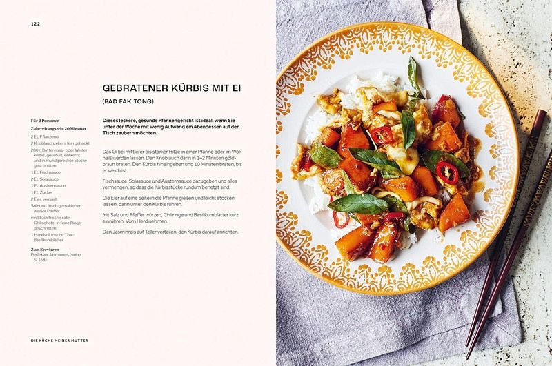 Thai-Snacks: Hähnchen-Saté; Riesengarnelen im Schlafrock; Tintenfischringe mit knusprigem Knoblauch; Knusprige Teigtaschen mit Schweinehack; Maisbratlinge Teller zum Teilen: Scharfer Glasnudelsalat; Scharfer Salat mit paniertem Lachs; Toast mit Schweinehack und Ar Jard; Scharfer Maissalat; Pfefferblatt-Wraps Streetfood: Sauer-scharfe Suppe mit Garnelen; Gebratene Nudeln süßsauer-scharf; Gebratene Nudeln mit Garnelen; Knusprige Nudeln mit Sauce; Knusprige Pfannkuchen; Gebratener Reis mit Ananas; Marinierte Thai-Chickenwings; Scharfer Papayasalat Schnelle Currys: Grünes Thai-Curry mit Hähnchen; Panang-Curry mit Rindfleisch; Chu-Chi-Curry mit Lachs; Gelbes Thai-Curry mit Lamm Die Küche meiner Mutter Gebratener grüner Spargel mit Garnelen; Süßsaures Gemüse mit Hähnchenfleisch; Knuspriges Omelett; Rindfleisch mit Brokkoli In Austernsauce; Gebratener Kürbis mit Ei Thai vegetarisch: Rotes Veganes Curry mit Tofu und Bohnen; Knuspriger Blumenkohl mit süßer Tamarindensauce; Gebratene Pilze mit Chili und Thai-Basilikum; Gegrillte Aubergine mit Chili und Kokossauce Süße Leckereien: Kürbis In Kokossirup; Klebreis mit Mango; Melonenkugeln mit Sago In Kokossirup; Mini-Kokospfannkuchen