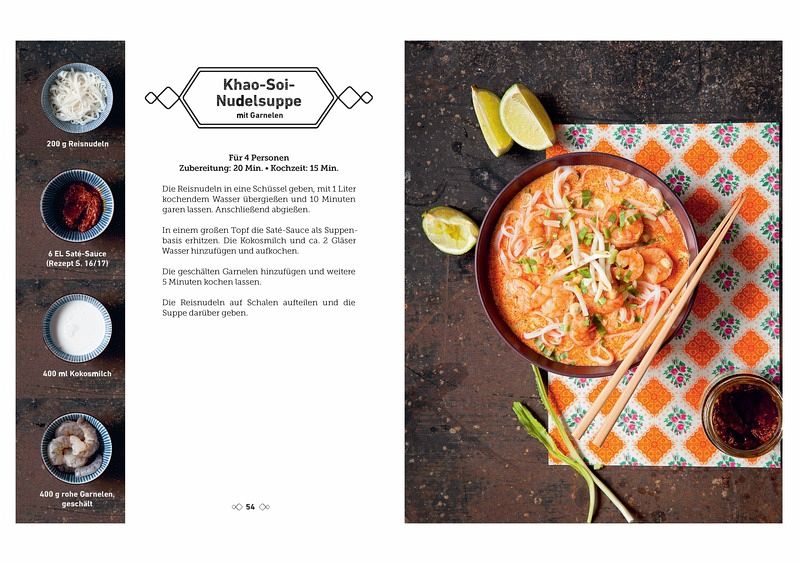 Schnell & einfach, aber authentisch! Die echte Aroma-Küche: Saure Limette mit süßer Kokosnuss. Scharfer Ingwer mit frischem Koriander. Köstlich, exotisch mit nur 4 ZutatenHühnchencurry mit Thai-Basilikum, Pad Thai oder Salat mit grüner Papaya. Oder Desserts wie Milchreis mit Kokosmilch, Mangosorbet oder JasminkuchenOriginalrezepte aus der beliebtesten asiatischen Küche