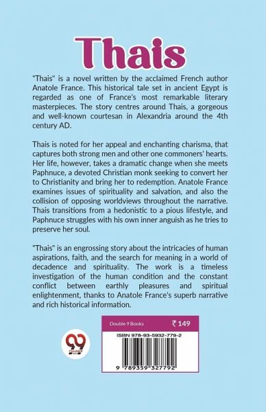"Thais" is a novel written by the acclaimed French author Anatole France. This historical tale set in ancient Egypt is regarded as one of France's most remarkable literary masterpieces. The story centres around Thais, a gorgeous and well-known courtesan in Alexandria around the 4th century AD. Thais is noted for her appeal and enchanting charisma, that captures both strong men and other one commoners' hearts. Her life, however, takes a dramatic change when she meets Paphnuce, a devoted Christian monk seeking to convert her to Christianity and bring her to redemption. Anatole France examines issues of spirituality and salvation, and also the collision of opposing worldviews throughout the narrative. Thais transitions from a hedonistic to a pious lifestyle, and Paphnuce struggles with his own inner anguish as he tries to preserve her soul. "Thais" is an engrossing story about the intricacies of human aspirations, faith, and the search for meaning in a world of decadence and spirituality. The work is a timeless investigation of the human condition and the constant conflict between earthly pleasures and spiritual enlightenment, thanks to Anatole France's superb narrative and rich historical information.