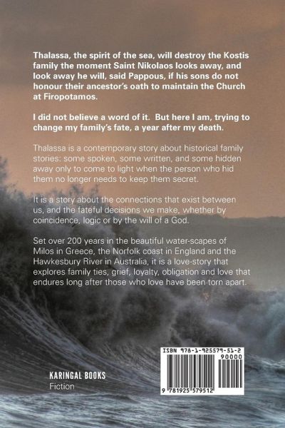 Thalassa, the spirit of the sea, will destroy the Kostis family the moment Saint Nikolaos looks away, and look away he will, said Pappous, if his sons do not honour their ancestor's oath to maintain the Church at Firopotamos. I did not believe a word of it. But here I am, trying to change my family's fate, a year after my death. Thalassa is a contemporary story about historical family stories: some spoken, some written, and some hidden away only to come to light when the person who hid them no longer needs to keep them secret. It is a story about the connections that exist between us, and the fateful decisions we make, whether by coincidence, logic or by the will of a God. Set over 200 years in the beautiful water-scapes of Milos in Greece, the Norfolk coast in England and the Hawkesbury River in Australia, it is a love-story that explores family ties, grief, loyalty, obligation and love that endures long after those who love have been torn apart.