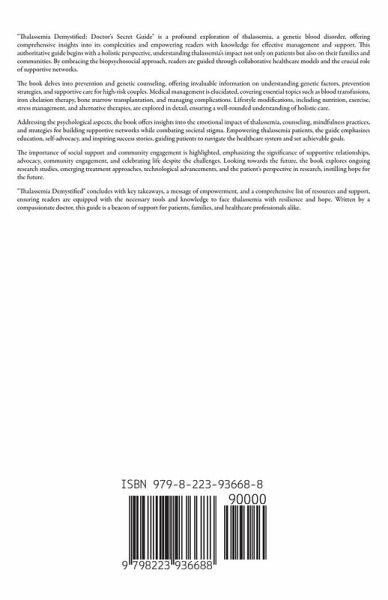 "Thalassemia Demystified: Doctor's Secret Guide" is a profound exploration of thalassemia, a genetic blood disorder, offering comprehensive insights into its complexities and empowering readers with knowledge for effective management and support. This authoritative guide begins with a holistic perspective, understanding thalassemia's impact not only on patients but also on their families and communities. By embracing the biopsychosocial approach, readers are guided through collaborative healthcare models and the crucial role of supportive networks. The book delves into prevention and genetic counseling, offering invaluable information on understanding genetic factors, prevention strategies, and supportive care for high-risk couples. Medical management is elucidated, covering essential topics such as blood transfusions, iron chelation therapy, bone marrow transplantation, and managing complications. Lifestyle modifications, including nutrition, exercise, stress management, and alternative therapies, are explored in detail, ensuring a well-rounded understanding of holistic care. Addressing the psychological aspects, the book offers insights into the emotional impact of thalassemia, counseling, mindfulness practices, and strategies for building supportive networks while combating societal stigma. Empowering thalassemia patients, the guide emphasizes education, self-advocacy, and inspiring success stories, guiding patients to navigate the healthcare system and set achievable goals. The importance of social support and community engagement is highlighted, emphasizing the significance of supportive relationships, advocacy, community engagement, and celebrating life despite the challenges. Looking towards the future, the book explores ongoing research studies, emerging treatment approaches, technological advancements, and the patient's perspective in research, instilling hope for the future. "Thalassemia Demystified" concludes with key takeaways, a message of empowerment, and a comprehensive list of resources and support, ensuring readers are equipped with the necessary tools and knowledge to face thalassemia with resilience and hope. Written by a compassionate doctor, this guide is a beacon of support for patients, families, and healthcare professionals alike.