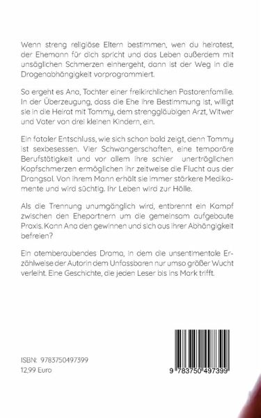 Wenn streng religiöse Eltern bestimmen, wen du heiratest, der Ehemann für dich spricht und das Leben ausserdem mit unsäglichen Schmerzen einhergeht, dann ist der Weg in die Drogenabhängigkeit vorprogrammiert.So ergeht es Ana, Tochter einer freikirchlichen Pastorenfamilie. In der Überzeugung, dass die Ehe ihre Bestimmung ist, willigt sie in die Heirat mit Tommy, dem strenggläubigen Arzt, Witwer und Vater von drei kleinen Kindern, ein. Ein fataler Entschluss, wie sich schon bald zeigt, denn Tommy ist sexbesessen. Vier Schwangerschaften, eine temporäre Berufstätigkeit und vor allem ihre schier unerträglichen Kopfschmerzen ermöglichen ihr zeitweise die Flucht aus der Drangsal. Von ihrem Mann erhält sie immer stärkere Medikamente und wird süchtig. Ihr Leben wird zur Hölle.Als die Trennung unumgänglich wird, entbrennt ein Kampf zwischen den Ehepartnern um die gemeinsam aufgebaute Praxis. Kann Ana den gewinnen und sich aus ihrer Abhängigkeit befreien? Ein atemberaubendes Drama, in dem die unsentimentale Erzählweise der Autorin dem Unfassbaren nur umso grössere Wucht verleiht. Eine Geschichte, die jeden Leser bis ins Mark trifft.