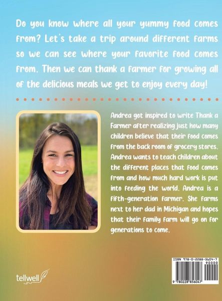 Andrea got inspired to write Thank a Farmer after realizing just how many children believe that their food comes from the back room of grocery stores. Andrea wants to teach children about the different places that food comes from and how much hard work is put into feeding the world. Andrea is a fifth-generation farmer. She farms next to her dad in Michigan and hopes that their family farm will go on for generations to come.