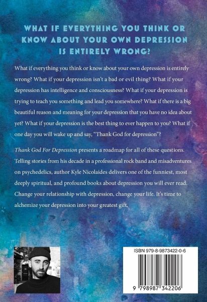 Change your relationship with depression, change your life. What if everything you think or know about your own depression is entirely wrong? What if your depression isn't a bad or evil thing? What if your depression has intelligence and consciousness? What if your depression is trying to teach you something and lead you somewhere? What if there is a big beautiful reason and meaning for your depression that you have no idea about yet? What if your depression is the best thing to ever happen to you? What if one day you will wake up and say, "Thank God for depression"? "Thank God For Depression" presents a roadmap for all of these questions. Telling stories from his decade in a professional rock band and misadventures on psychedelics, author Kyle Nicolaides delivers one of the funniest, deeply spirituality, and most profound books you will ever read on depression. It's time to alchemize your depression into your greatest gift.