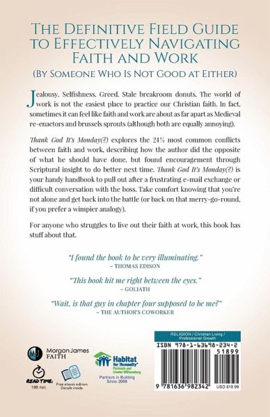 The Definitive Field Guide to Effectively Navigating Faith and Work (By Someone Who Is Not Good at Either)Jealousy. Selfishness. Greed. Stale breakroom donuts. Work is not the easiest place to practice our Christian faith. In fact, sometimes it can feel like faith and work are about as far apart as Medieval re-enactors and brussels sprouts (although both are equally annoying).Thank God It's Monday(?) explores the 24 (give or take) most common conflicts between faith and work, describing how the author did the opposite of what he should have done, but found encouragement through Scriptural insight to do better next time. Thank God It’s Monday(?) is your handy handbook to pull out after a frustrating e-mail exchange or a difficult conversation with the boss.Here’s one reviewer’s take:"This book is a must read for almost everyone. It guides you through almost every aspect of pitfalls you face at work. It also gives you positive goals to pursue to make your workplace better and more Christ centered. Some things you may already know, but many things in the book force you to stop and rethink the way you live."For anyone who struggles to live out their faith at work, this book has stuff about that.
