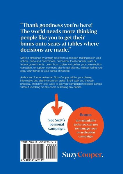 Thank goodness you're here! The world needs more thinking people like you to get their bums onto seats at tables where decisions are made. Make a difference by getting elected to a decision-making role in your school, clubs and committees, on boards, local councils, state or federal governments. This how-to guide will help you plan and deliver your own election campaign, or support someone else to get elected, without losing your soul, your friends or your sense of humour. Author Suzy Cooper is your cheery, informative and slightly irreverent guide, walking you through a range of effective, often low cost ways of getting your message across that might get you elected without knocking on a single door or kissing any babies. She's a communications professional with more than 20 years of experience, a stand-up comedian, and a former alderman on the City of Hobart council in Tasmania, Australia.