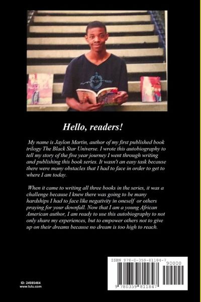 Hello, readers! My name is Jaylon Martin, author of my first published book series the Black Star Universe. I wrote this autobiography to tell my story of the five year journey I went through writing and publishing this book series. It wasn't an easy task because there were many obstacles that I had to face in order to get to where I am today. When it came to writing all three books in the series, it was a challenge because I knew there were going to be many hardships I had to face: negativity in oneself or others praying for your downfall. Now that I am a young African American author, I am ready to use this autobiography to not only share my experiences, but to empower others not to give up on their dreams because no dream is too high to reach.