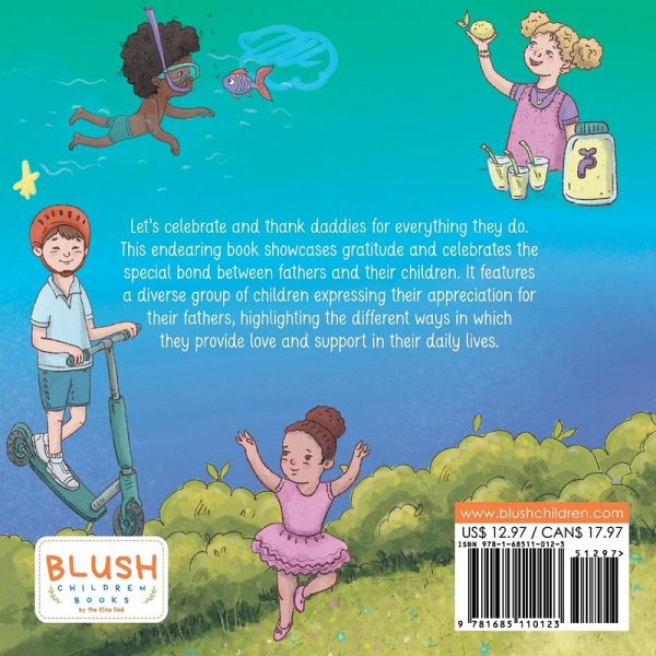 Every day is Father's Day. Let's celebrate and thank daddies for everything they do. This endearing book showcases gratitude and celebrates the special bond between fathers and their children. It features a diverse group of children expressing their appreciation for their fathers, highlighting the different ways in which they provide love and support in their daily lives. Families of all backgrounds can enjoy reading this heartwarming book together. This book not only teaches children about gratitude but also provides an opportunity for dads to reflect on why their children admire them. By practicing positive characteristics and behaviors, fathers can become great examples for their children who learn by watching their actions. This can lead to a positive impact in our communities and the world at large.