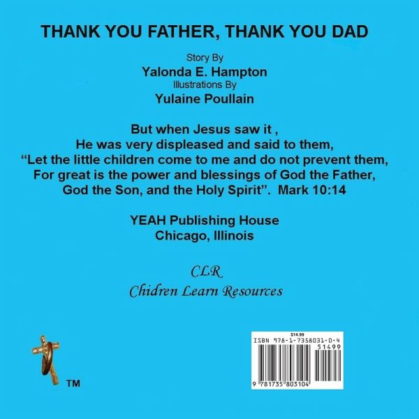 Thank You Father, Thank You Dad is about a boy who sees his dad in his bedroom kneeling down with his head bowed and praying. But Jonathan the son thinks he's just talking out loud because he doesn't see anyone in the room. Jonathan peeks into the door and asks his dad who he is talking to. He's very curious. He is at the age where he wants to know about everything and he expects his dad to tell him. Jonathan thinks his dad is a super-terrific father, who knows everything. He wants to be like him and do things that he does. Jonathan looks to his dad to give him all the answers to his questions so he can be as terrific as his dad is. His dad tells him that he was praying to God. Jonathan wants to know who God is and if he can pray to God like him. This encounter opens up a beautiful and fulfilling relationship between the dad and the son. They share personal and intimate time together exchanging questions and answers. This draws them into a spiritual connection and it reveals a heavenly love of a father to his son. Their dialog expresses emotions from excitement to tears and from tickles to warm hugs. They show to each other respect, honor and a great deal of emotional security. Because the son trust that his dad will tell him everything he wants to know. His dad realizes that his son is deserving of an explanation in his quest for answers and that brings out more interesting and important ways to build character and trust in both the dad and son. This book is meant to be a tool to motivate parents to share their faith in God with their sons and daughters as early as possible in their youth. To open up an occasion for quality time to inspire and encourage biblical teachings of who God is and how important it is to know God personally through prayer and dedication. It's also a means for building intimacy in family social time that involves spiritual involvement that leads to praying together, studying Bible verses, learning new words that are meaningful for growth and development. There are many ways the book uses repetition for forming thought patterns to remember biblical terminology for foundational groundwork. The story itself has the dialog pattern of asking a question and getting an answer with illustrations that are verbal and in full color illustrations. This is to enhance cognitive awareness. There is a glossary to refer back for terminology and meaning of words. A word search puzzle for fun and intellectual aptitude. Bible Scriptures to encourage in-depth thinking for decision making and Bible study. It's a great gift for any occasion and to share during family time or Christian education study.