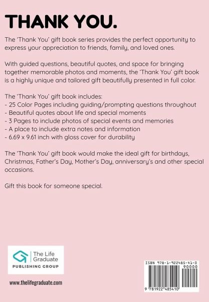 The 'Thank You' gift book series provides the perfect opportunity to express your appreciation to friends, family, and loved ones. With guided questions, beautiful quotes, and space for bringing together memorable photos and moments, the 'Thank You' gift book is a highly unique and tailored gift beautifully presented in full color. The 'Thank You' gift book includes: - 25 Color Pages including guiding/prompting questions - Beautiful quotes about life and special moments - 3 Pages to include photos of special events and memories - A place to include extra notes and information as part of your gift - 6.69 x 9.61 inch with gloss cover for durability The 'Thank You' gift book would make the ideal gift for birthdays, Christmas, Father's Day, Mother's Day, anniversary's and many other special occasions. Give this book to someone special and let them know how much you appreciate them.