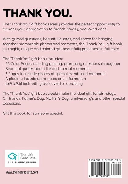 The 'Thank You' gift book series provides the perfect opportunity to express your appreciation to friends, family, and loved ones. With guided questions, beautiful quotes, and space for bringing together memorable photos and moments, the 'Thank You' gift book is a highly unique and tailored gift beautifully presented in full color. The 'Thank You' gift book includes: - 25 Color Pages including guiding/prompting questions - Beautiful quotes about life and special moments - 3 Pages to include photos of special events and memories - A place to include extra notes and information as part of your gift - 6.69 x 9.61 inch with gloss cover for durability The 'Thank You' gift book would make the ideal gift for birthdays, Christmas, Father's Day, Mother's Day, anniversary's and many other special occasions. Give this book to someone special and let them know how much you appreciate them.
