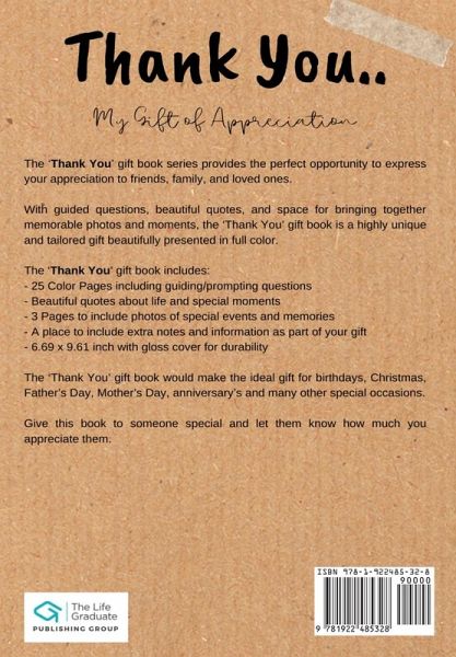 The 'Thank You' gift book series provides the perfect opportunity to express your appreciation to friends, family, and loved ones. With guided questions, beautiful quotes, and space for bringing together memorable photos and moments, the 'Thank You' gift book is a highly unique and tailored gift beautifully presented in full color. The 'Thank You' gift book includes: - 25 Color Pages including guiding/prompting questions - Beautiful quotes about life and special moments - 3 Pages to include photos of special events and memories - A place to include extra notes and information as part of your gift - 6.69 x 9.61 inch with gloss cover for durability The 'Thank You' gift book would make the ideal gift for birthdays, Christmas, Father's Day, Mother's Day, anniversary's and many other special occasions. Gift this book for someone special and let them know how much you appreciate them.