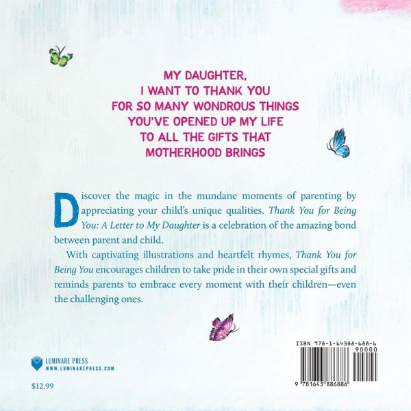 My daughter, I want to thank you For so many wondrous things You've opened up my life To all the gifts that motherhood brings Discover the magic in the mundane moments of parenting by appreciating your child's unique qualities. Thank You for Being You: A Letter to My Daughter is a celebration of the amazing bond between parent and child. ¿With captivating illustrations and heartfelt rhymes, Thank You for Being You encourages children to take pride in their own special gifts and reminds parents to embrace every moment with their children-even the challenging ones.