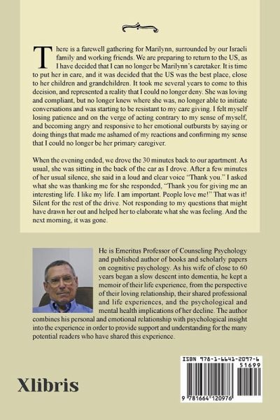 There is a farewell gathering for Marilynn, surrounded by our Israeli family and working friends. We are preparing to return to the US, as I have decided that I can no longer be Marilynn's caretaker. It is time to put her in care, and it was decided that the US was the best place, close to her children and grandchildren. It took me several years to come to this decision, and represented a reality that I could no longer deny. She was loving and compliant, but no longer knew where she was, no longer able to initiate conversations and was starting to be resistant to my care giving. I felt myself losing patience and on the verge of acting contrary to my sense of myself, and becoming angry and responsive to her emotional outbursts by saying or doing things that made me ashamed of my reactions and conAirming my sense that I could no longer be her primary caregiver. When the evening ended, we drove the 30 minutes back to our apartment. As usual, she was sitting in the back of the car as I drove. After a few minutes of her usual silence, she said in a loud and clear voice "Thank you." I asked what she was thanking me for she responded, "Thank you for giving me an interesting life. I like my life. I am important. People love me!" That was it! Silent for the rest of the drive. Not responding to my questions that might have drawn her out and helped her to elaborate what she was feeling. And the next morning, it was gone.