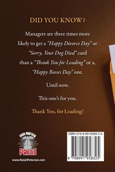 Thank You for Leading: A Gift for Managers is a heartfelt thank-you to every manager who's weathered the grind. This mini-book packs a true story: a nursing home manager, drowning in chaos, finds a rare letter from a resident that redefines leadership. After 31 years of hired-and-fired battles, one "thank you" reveals the truth-it's not just a burden, it's a gift. A powerful list follows, honoring the unsung hero's: the late nights, the snowstorms, and all the chaos that comes with the job. This isn't cookie-cutter leadership fluff. It's raw, personal, and rooted in decades of scars. In two chapters, it stands alone as a tribute to managers-rookie or vet-saying, "You're seen." But it's also a taste of more: the full Thank You for Leading unpacks leadership's systems, psychology, and rules, with a secret chapter you'll hunt for. Perfect as a gift, giveaway, or desk-side boost, this is your "thank you" for leading.