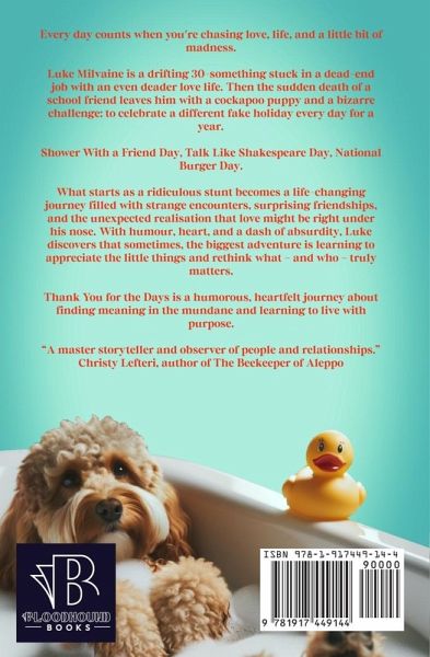Every day counts when you're chasing love, life, and a little bit of madness... Luke Milvaine is a drifting 30-something stuck in a dead-end job with an even deader love life. Then the sudden death of a school friend leaves him with a cockapoo puppy and a bizarre challenge: to celebrate a different fake holiday every day for a year. Shower With a Friend Day, Talk Like Shakespeare Day, National Burger Day... What starts as a ridiculous stunt becomes a life-changing journey filled with strange encounters, surprising friendships, and the unexpected realisation that love might be right under his nose. With humour, heart, and a dash of absurdity, Luke discovers that sometimes, the biggest adventure is learning to appreciate the little things and rethink what - and who - truly matters. Thank You for the Days is a humorous, heartfelt journey about finding meaning in the mundane and learning to live with purpose.