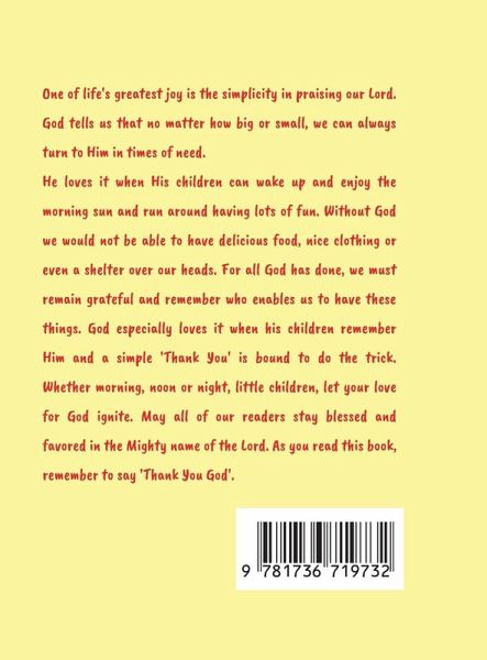 One of life's greatest joy is the simplicity in praising our Lord. God tells us that no matter how big or small, we can always turn to Him in times of need. He loves it when His children can wake up and enjoy the morning sun and run around having lots of fun. Without God we would not be able to have delicious food, nice clothing or even a shelter over our heads. For all God has done, we must remain grateful and remember who enables us to have these things. God especially loves it when his children remember Him and a simple 'Thank You' is bound to do the trick. Whether morning, noon or night, little children, let your love for God ignite. May all of our readers stay blessed and favored in the Mighty name of the Lord. As you read this book, remember to say 'Thank You God'.