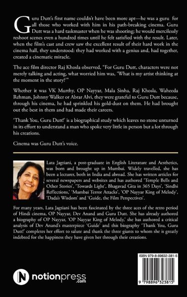 Guru Dutt's first name couldn't have been more apt-he was a guru for all those who worked with him in his path-breaking cinema. Guru Dutt was a hard taskmaster when he was shooting; he would mercilessly reshoot scenes even a hundred times until he felt satisfied with the result. Later, when the film's cast and crew saw the excellent result of their hard work in the cinema hall, they understood: they had worked with a genius and, had together, created a cinematic miracle. The ace film director Raj Khosla observed, "For Guru Dutt, characters were not merely talking and acting, what worried him was, 'What is my artist thinking at the moment in the story?'" Whether it was VK Murthy, OP Nayyar, Mala Sinha, Raj Khosla, Waheeda Rehman, Johnny Walker or Abrar Alvi, they were grateful to Guru Dutt because, through his cinema, he had sprinkled his gold-dust on them. He had brought out the best in them and had made their careers. 'Thank You, Guru Dutt!' is a biographical study which leaves no stone unturned in its effort to understand a man who spoke very little in person but a lot through his creations. Cinema was Guru Dutt's voice