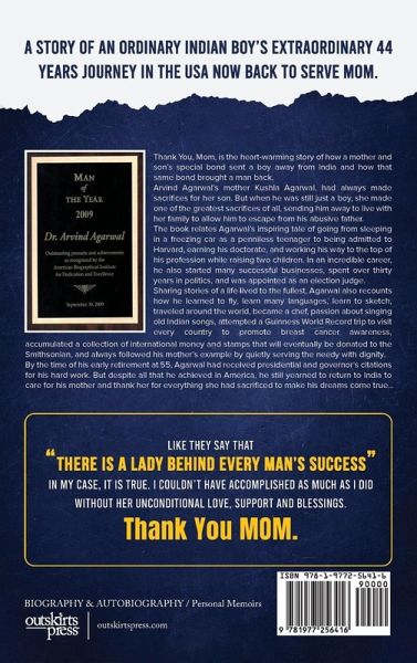 Thank You, Mom, is the heart-warming story of how a mother and son's special bond sent a boy away from India and how that same bond brought a man back. Arvind Agarwal's mother Kushla Agarwal, had always made sacrifices for her son. But when he was still just a boy, she made one of the greatest sacrifices of all, sending him away to live with her family to allow him to escape from his abusive father. The book relates Agarwal's inspiring tale of going from sleeping in a freezing car as a penniless teenager to being admitted to Harvard, earning his doctorate, and working his way to the top of his profession while raising two children. In an incredible career, he also started many successful businesses, spent over thirty years in politics, and was appointed as an election judge. Sharing stories of a life lived to the fullest, Agarwal also recounts how he learned to fly, learn many languages, learn to sketch, traveled around the world, became a chef, passion about singing old Indian songs, attempted a Guinness World Record trip to visit every country to promote breast cancer awareness, accumulated a collection of international money and stamps that will eventually be donated to the Smithsonian, and always followed his mother's example by quietly serving the needy with dignity. By the time of his early retirement at 55, Agarwal had received presidential and governor's citations for his hard work. But despite all that he achieved in America, he still yearned to return to India to care for his mother and thank her for everything she had sacrificed to make his dreams come true... Like they say that "There is a lady behind every man's success" in my case, it is true. I couldn't have accomplished as much as I did without her unconditional love, support and blessings. Thank You, MOM.