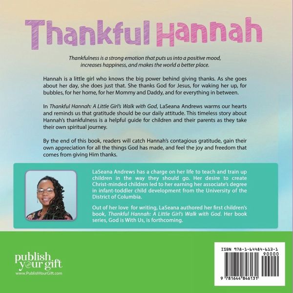 Thankfulness is a strong emotion that puts us into a positive mood, increases happiness, and makes the world a better place. Hannah is a little girl who knows the big power behind giving thanks. As she goes about her day, she does just that. She thanks God for Jesus, for waking her up, for bubbles, for her home, for her Mommy and Daddy, and for everything in between. In Thankful Hannah: A Little Girl's Walk with God, LaSeana Andrews warms our hearts and reminds us that gratitude should be our daily attitude. This timeless story about Hannah's thankfulness is a helpful guide for children and their parents as they take their own spiritual journey. By the end of this book, readers will catch Hannah's contagious gratitude, gain their own appreciation for all the things God has made, and feel the joy and freedom that comes from giving Him thanks.
