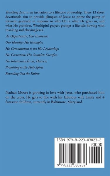 Thanking Jesus is an invitation to a lifestyle of worship. These 13 short devotionals aim to provide glimpses of Jesus: to prime the pump of intimate gratitude in response to who He is, what He gives us, and what He promises. Worshipful prayers prompt a lifestyle flowing with thanking and obeying Jesus. An Opportunity Our Existence Our Identity His Example His Commitment to us His Leadership His Correction His Complete Sacrifice His Intercession for us Heaven Promising us the Holy Spirit Revealing God the Father